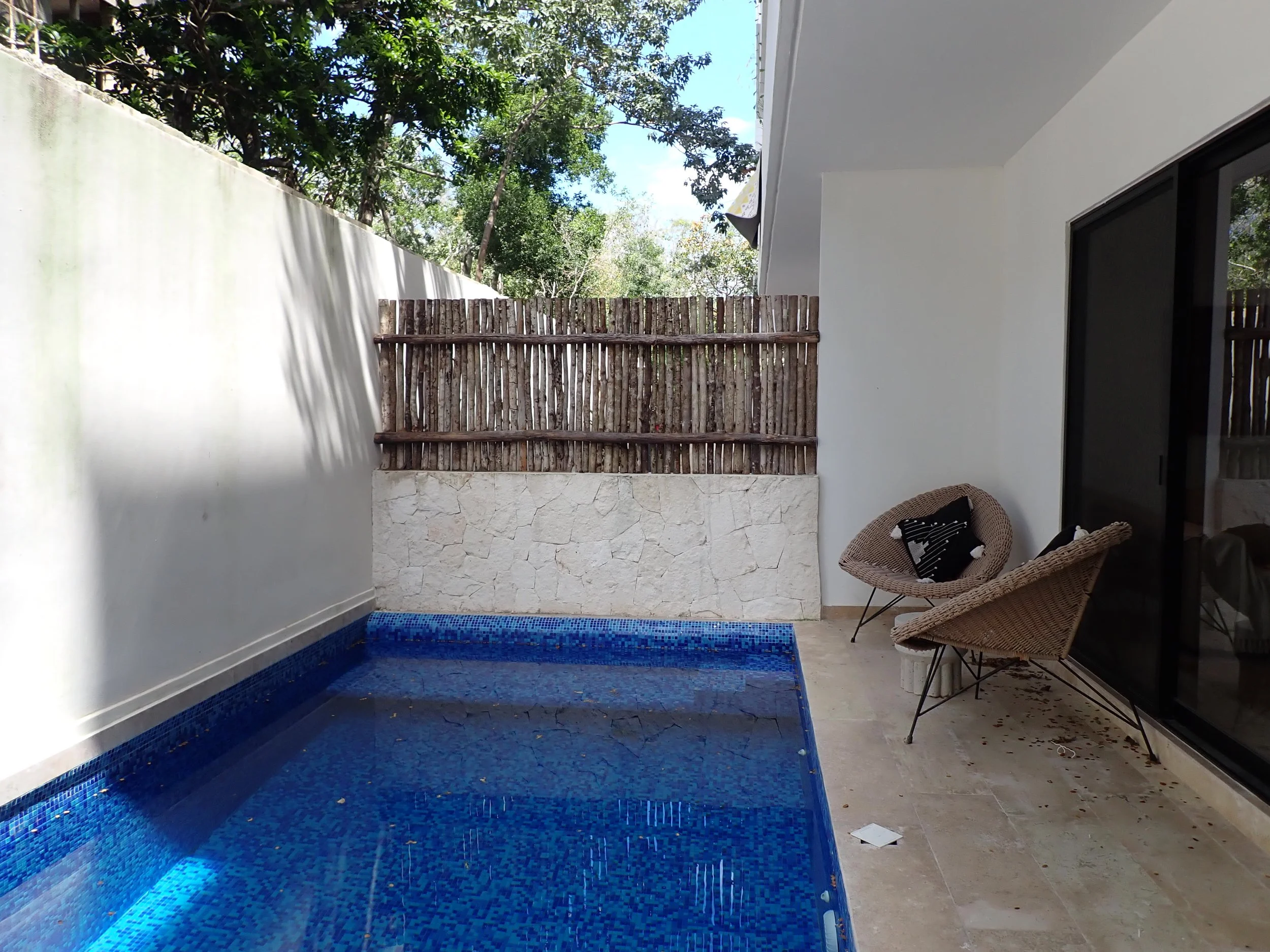 a small space with a pool right outside, between the bedroom and the living room.